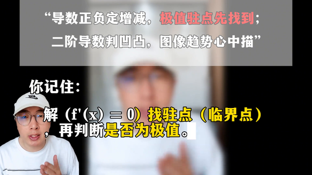 注:点先找到。二阶导数判凹凸,图像趋势心中描"。什么意思?记住:倒数正负定增减,一阶导数(f"(x)的正负直接决定函数单调性。极值注点先找到解(f"(x)=0)找驻点(临界点),再判断是否为极值。二阶导数(f"(x)正→凹,负→凸,而且可辅助判断极值类型的题!